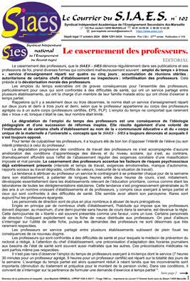Le casernement des professeurs, que le SIAES - SIES dénonce régulièrement dans ses publications et ses professions de foi, prend diverses formes qui coïncident malheureusement souvent : emploi du temps « à trous » ; service d’enseignement réparti sur quatre ou cinq jours ; accumulation de réunions stériles ; autoritarisme de certains chefs d’établissement ou inspecteurs ; infantilisation des professeurs. Cela préside à la dévalorisation morale des professeurs. Les emplois du temps exécrables ont de graves conséquences pour l’ensemble des professeurs, particulièrement pour ceux qui sont confrontés à des difficultés de santé, qui ont un service partagé entre plusieurs établissements, qui ont la charge d’un membre de leur famille malade et/ou qui ont choisi d’exercer à temps partiel. Rappelons qu’il y a seulement deux ou trois décennies, la norme était un service d’enseignement réparti sur deux jours et demi à trois jours et demi, selon que le professeur appartienne au corps des professeurs agrégés ou à un autre corps (professeurs certifiés, EPS, PLP). L’emploi du temps ne comportait que rarement des « trous » et, lorsque c’était le cas, leur nombre était limité.