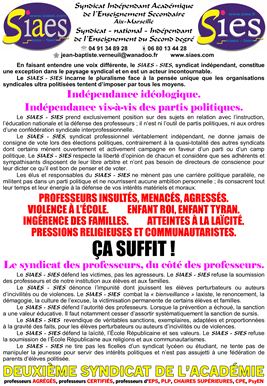 Deuxième syndicat de l'académie tous corps confondus. Syndicat indépendant Académique et National Le SIAES - SIES, LE syndicat indépendant ! |